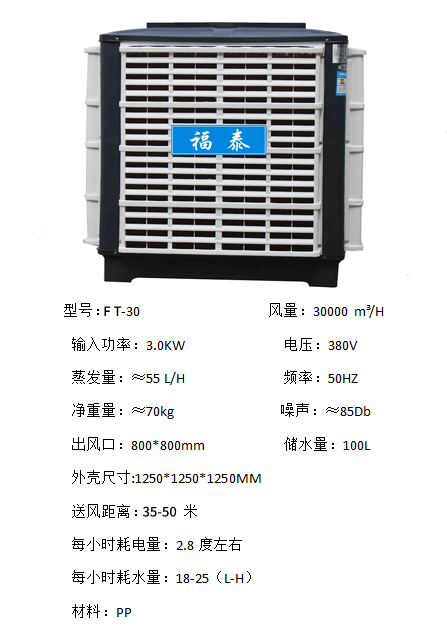 福泰环保空调性能稳定在越炎热的天气下降温的效果越好。适用于开敞式及半开敞式环境,能够直接输送自然风及输送降温后的凉风。室外新鲜空气经福泰蒸发式冷气机过滤、降温后向室内源源不断的大量输送,将室内带有异味、粉尘和混浊闷热的空气排出室外,同时兼顾换气降温及增加空气含氧量等多种效果。